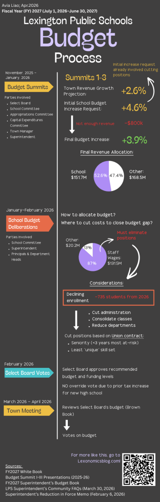 The purpose of this visual is to provide some clarification around the budget-making process for Lexington Public Schools. It focuses specifically on the development of a budget for the 2027 Fiscal Year.